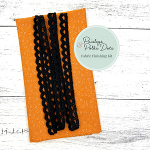 Fabric finishing kit for Halloween Cauldron by Primrose Cottage. Shown on Potion of Stitches cross stitch display.