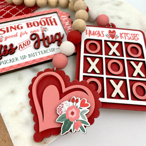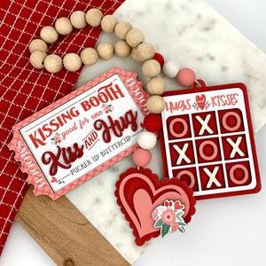 This DIY wood decor kit is a Carnival of Hugs ‘n’ Kisses! Line up your X’s and O’s in a game of Hugs ‘n’ Kisses, or maybe you’d rather raffle away your smooches at the Kissing Booth. Whatever your pleasure, this precious garland and raffle ticket add the perfect finishing touches to your tiered tray, shelf, mantel or Valentine’s tablescape.
