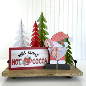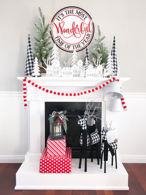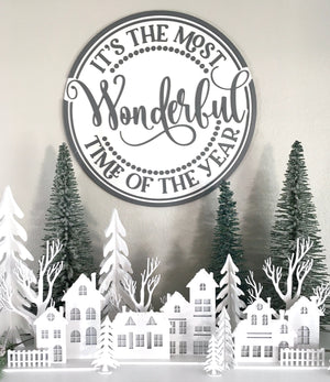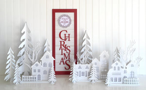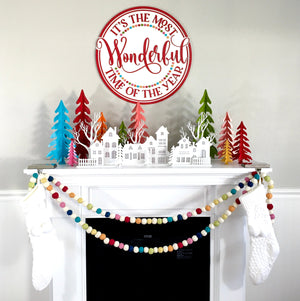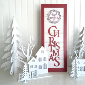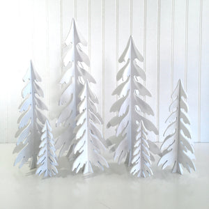 This set of 7 dimensional wood Christmas trees snap together easily and store flat when not in use.  The trees are cut from 1/8 inch MDF wood and come in various sizes; 16 inches, 13.5 inches, 11 inches, (2) 9 inches, and (2) 5.5 inches.  All you need is a little paint!