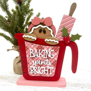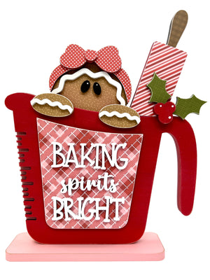 Craft up some sweet holiday fun with our DIY gingerbread measuring cup wood decor kit. The measuring cup has an adorable gingerbread girl peeking out with a striped candy cane rolling pin. The front of the measuring cup is adorned with the words, "Baking Spirits Bright." This project makes a wonderful decoration or gift for anyone who loves to bake.