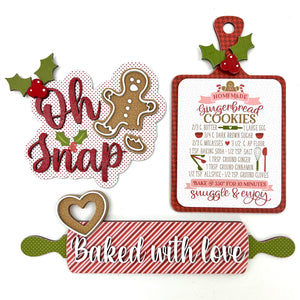 • Size: rolling pin 3 x 9.5 inches, recipe board 4 x 7 inches, Oh Snap sign 4.5 x 5 inches.