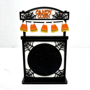 Introducing our Candy Corn Stand DIY Wood Craft Kit, the perfect Halloween-themed project to showcase your favorite finished cross stitch piece! This delightful stand is adorned with charming hanging candy corn and intricate spider web designs cut into the front of the stand. With easy assembly and a touch of spooky charm, it's the ideal way to display your festive handiwork and add a playful Halloween vibe to your decor. Get ready to wow your guests with your crafty talents and embrace the spirit of Halloween!