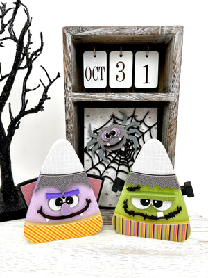 If you’re in the mood for some Halloween fun, then this is the perfect kit for you! The Candy Corn shaped wood pieces are designed to look like some of your favorite Halloween characters; Frankenstein and Dracula. Our DIY kit is perfect for your seasonal display, tiered tray, mantel, shelf or our new calendar cubby.