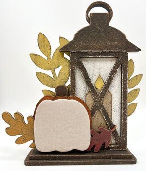 The dimensional lantern, pumpkin, and fall leaves create a beautiful layered effect, while the flat pumpkin front is the perfect spot to attach small cross stitch motifs or mini pillows. Whether you display it plain or add your latest stitch, this piece captures the warmth of fall gatherings and handmade creativity. (an extra pumpkin wood shape is provided for use with a cross stitch mounting)