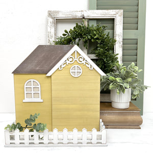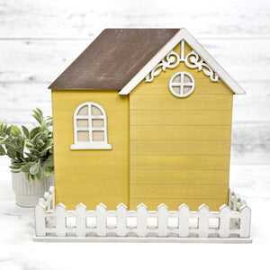 An adorable cottage-style home equipped with a charming white picket fence. Show off your completed cross stitch creations with this display made from unfinished wood, ready to be painted in any color you desire. This wooden display is perfect for matching with your cross stitch creation and includes a space up front to add plants or small cross stitch cushions. Painting instructions are provided for a seamless assembly process.