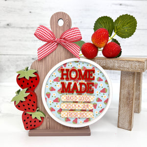 This Homemade Jam & Jelly Recipe Board Wood Decor is perfect for styling up tiered trays, shelves, or even our new leaning ladder. Featuring a recipe board with stacked strawberries along the edge, a circle that reads "Homemade Jam and Jelly, Baked Goods, and Pies", and an etched face resembling wood grain, it's the perfect craft project for spring and summer.