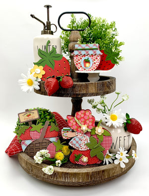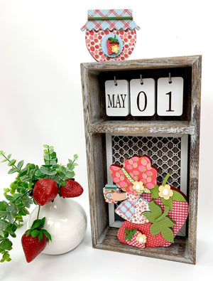 This precious strawberry girl wood craft kit sits perched atop a bounty of fresh summer strawberries. Can’t you just taste that sweet, tangy jam kissed by the summer’s sun? This delightful display will add charm to any seasonal display, tiered tray, mantel, shelf or our new calendar cubby.