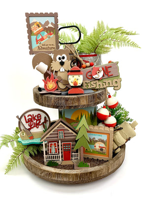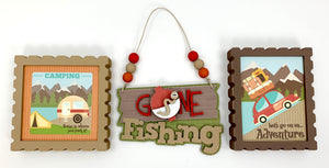 This gone fishing sign and outdoor blocks are perfect for the outdoor enthusiast.  Our DIY wood decor craft kit is a great way to bring your outdoor camping adventures inside.  Perfect for your seasonal display, tiered tray, mantel, shelf or our new calendar cubby.