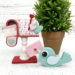 This adorable little lovebird is just waiting to insert his letter into the mailbox for his sweetheart. Craft up some Valentine fun with our lovebirds mailbox wood decor kit. These cute pieces will add flair as a self sitter, tabletop, or mantel Valentine decor.