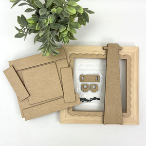 The inner display is crafted from high-quality MDF and features a delicately scalloped edge along with layered center pieces that offer endless creative potential. Customize it to your heart’s content—paint it in any color, decoupage it, or cover the center wood shapes with fabric to coordinate with your stitched design.