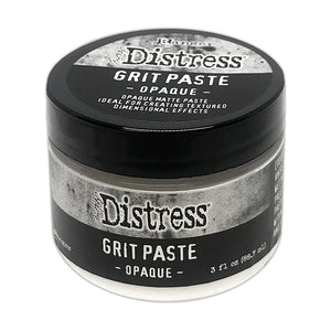 Tim Holtz Distress® Grit-Paste is a dimensional medium designed to provide a textured effect on a variety of craft and mixed-media surfaces. Apply with a palette knife or paintbrush directly on porous or non-porous surfaces for unique effects. Dries to a textured matte finish that can be colorized with your favorite Distress Ink, Crayon, Paint, or Stain. Available in Opaque in a 3 oz jar.